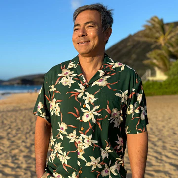 This green Star Orchid shirt is a classic from our archives. We last produced this shirt back in the early 80s when it was worn by Tom Selleck in a promotional poster for Magnum PI. The original Star Orchid print had the flowers much more densely packed and it actually did not sell as well as we thought it could. We made a version with the flowers more spread apart and it proved way more popular. Over the years, we ended up making this shirt in over a dozen different colors. Many fans of Magnum PI remember this shirt and have asked us if we plan to make it again. We're happy to say that after more than 40 years, the green Star Orchid is back!